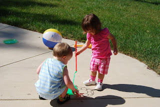I’ve been watching one of Jonah’s little friends from church for the past two weeks while her grandmother, who usually watches her, is out of town. I was happy to help out and make a little extra vacation money and I knew Jonah would enjoy having someone to play with. The first day Addyson was here Jonah could hardly control himself. He was sooooooo excited!! They had so much fun playing together the first day. Jonah went to sleep talking about Addyson and wondering where she was. The first word out of his mouth the next morning was “Addyson?” We explored outside, blew bubbles, threw the ball, made a cardboard playhouse, played in the kiddie pool and napped like there was no tomorrow. I even got brave enough to take them both to the Riverpark and play (could’ve used a double stroller for this one). We’ve definitely had lots of fun.