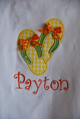During the Christmas season, I made a Reindeer Ribbon Ruffle Shirt for a customer. She absolutely loved it! This weekend we had a birthday party to go to and I made another Ribbon Ruffle Shirt with a warm weather theme. I used a flip flop applique and added Payton’s name in Curlz font. The ribbon ruffle added the final touch to the shirt.