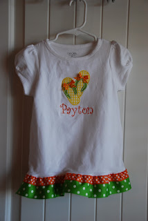 During the Christmas season, I made a Reindeer Ribbon Ruffle Shirt for a customer. She absolutely loved it! This weekend we had a birthday party to go to and I made another Ribbon Ruffle Shirt with a warm weather theme. I used a flip flop applique and added Payton’s name in Curlz font. The ribbon ruffle added the final touch to the shirt.