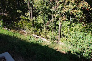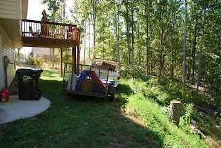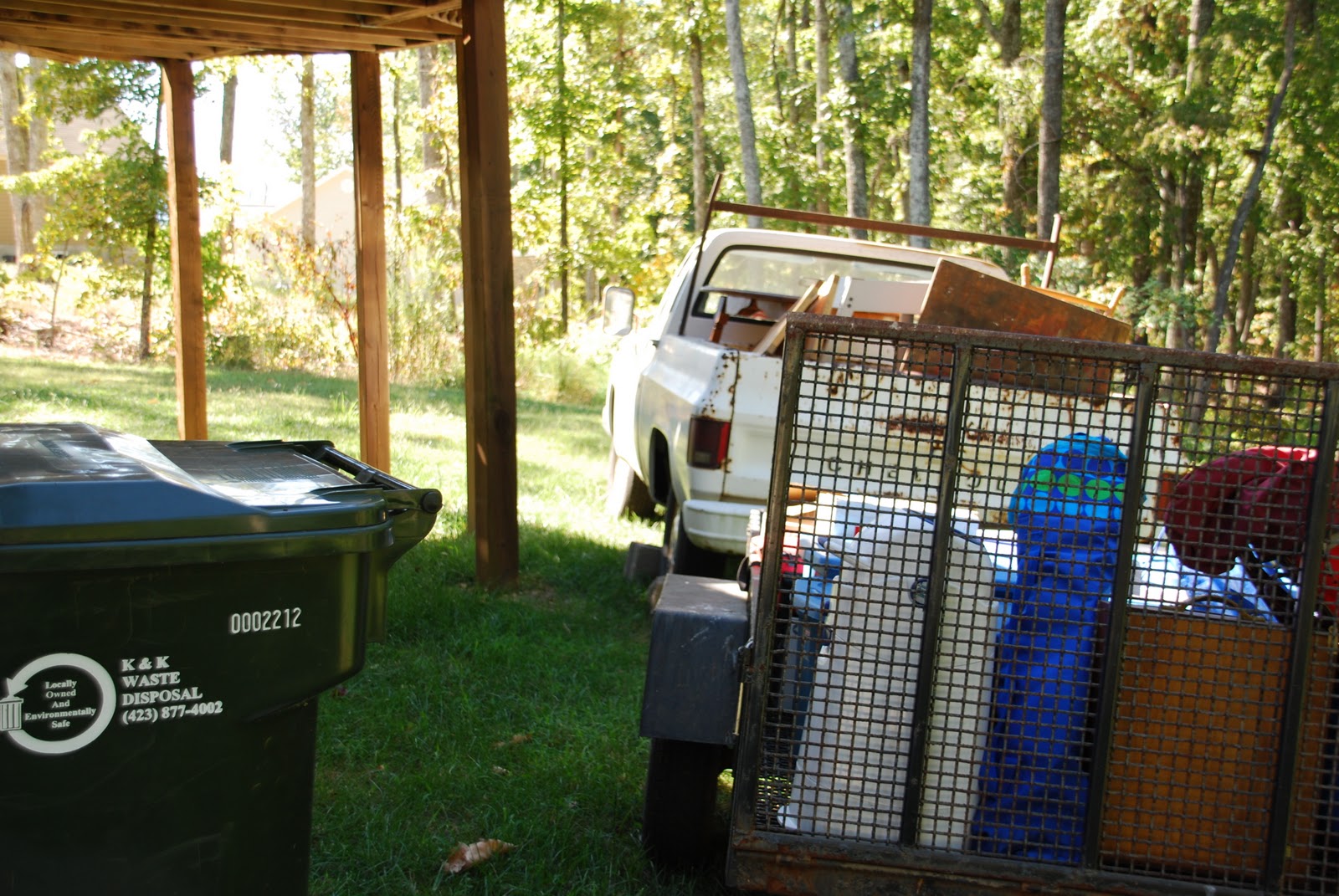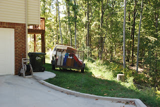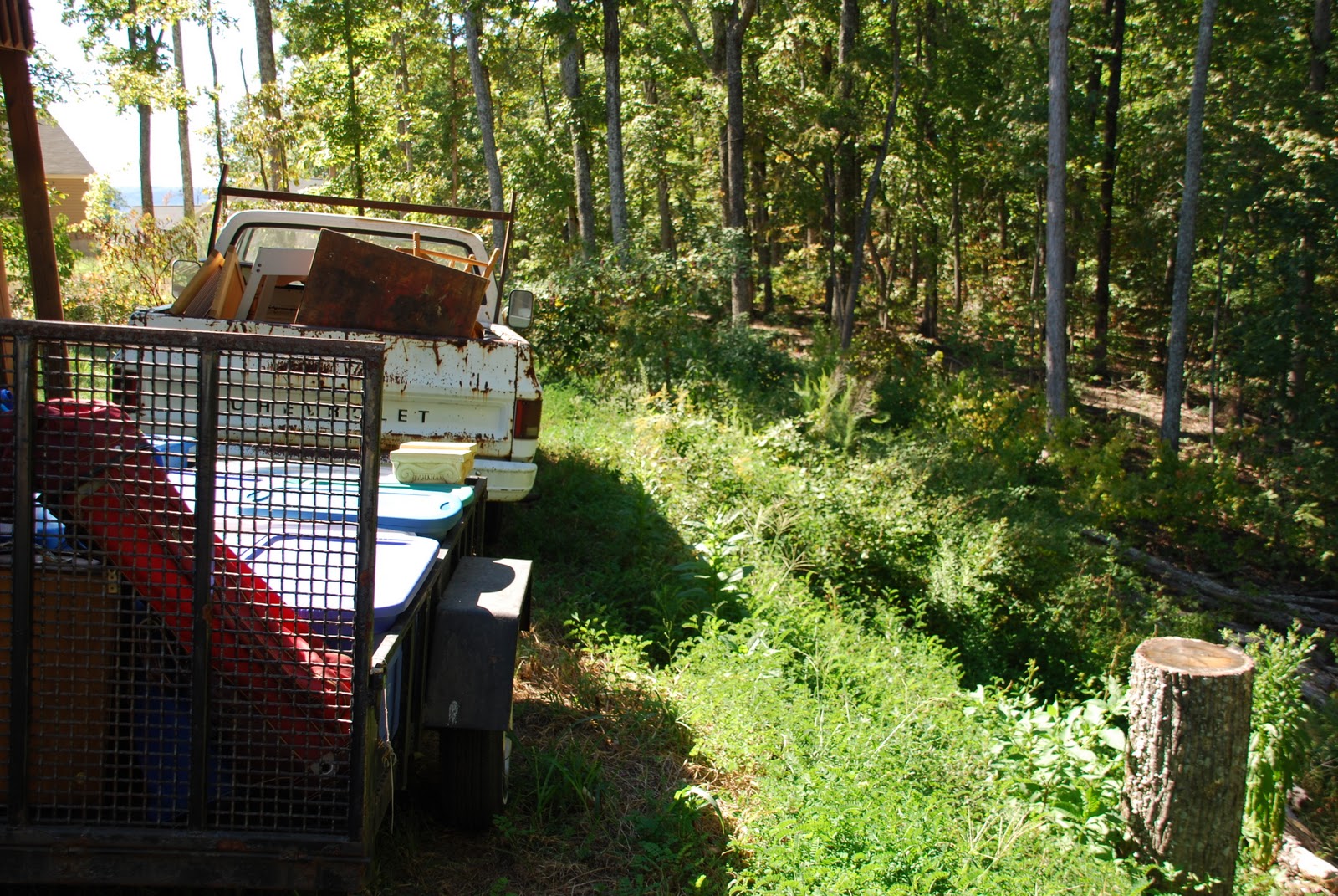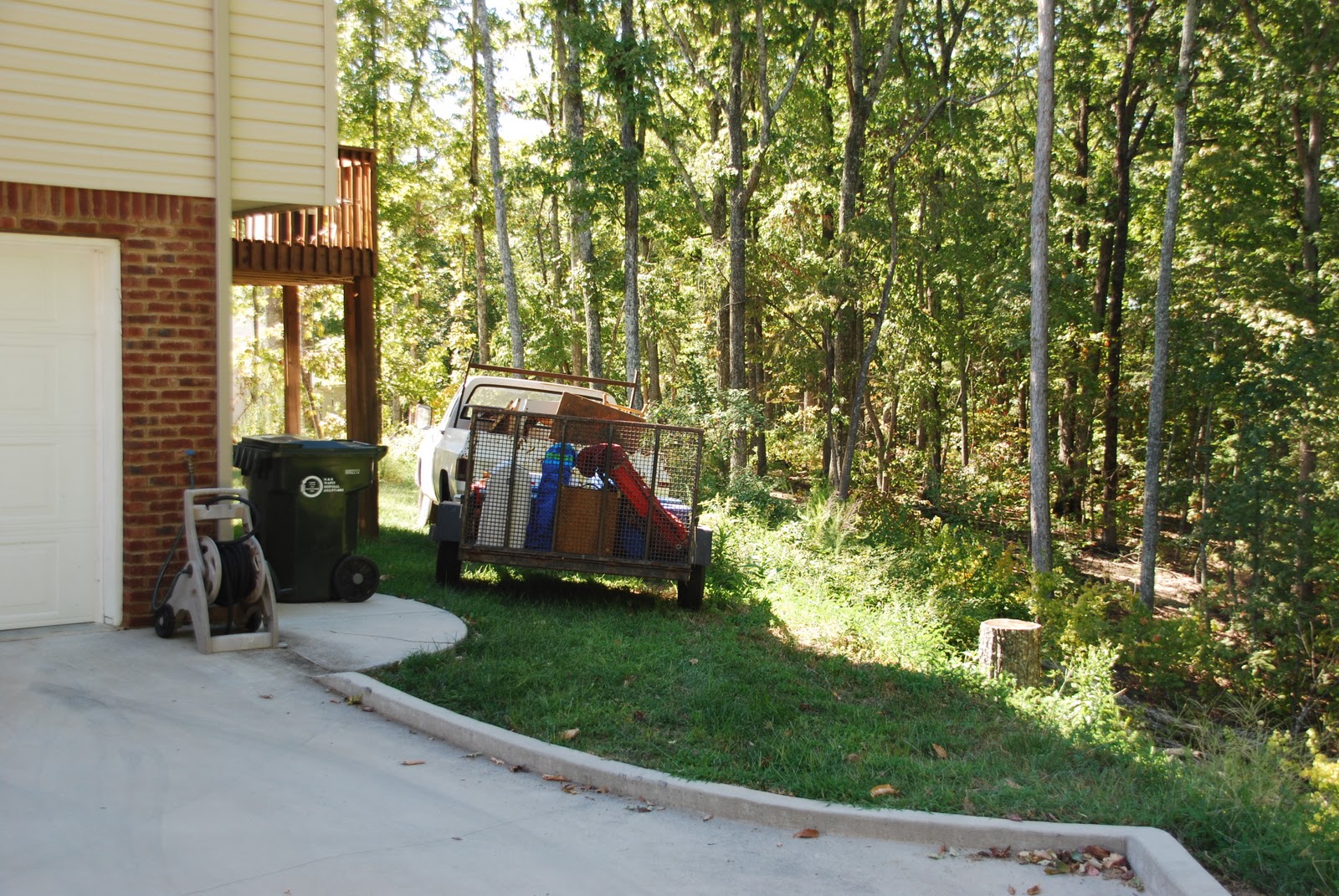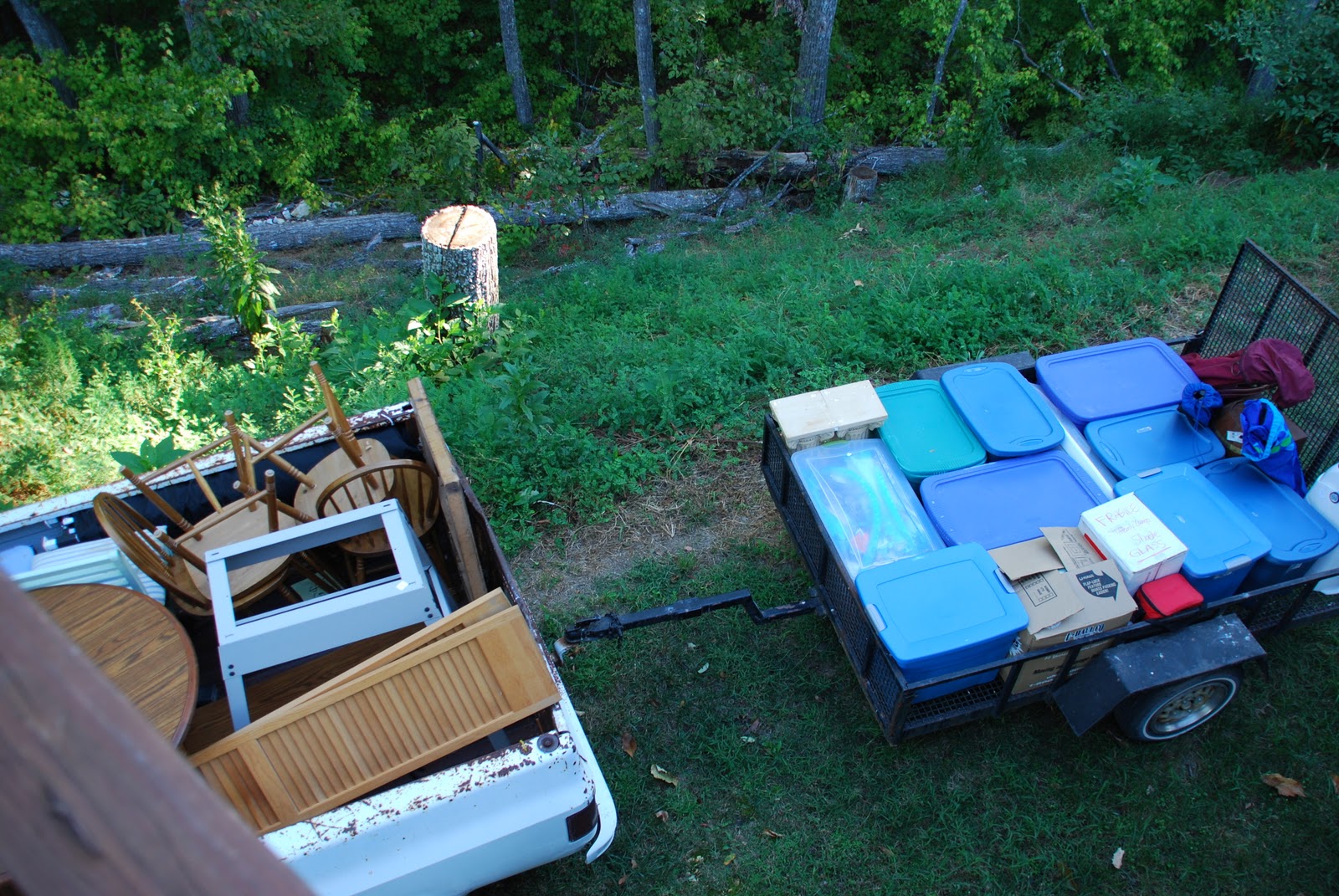 After the end of the day, we loaded up the leftover junk things and headed home in the truck. (Jonah stayed with Granny and Aunt Diana.) Ray was trying to back the trailer of junk things down our steep driveway, but since the truck lacks power steering…it was very difficult to get it right. Ray’s shoulder has been hurting (and may need rotator cuff surgery if he’d ever go to the doctor to check on it, ahem). The pain in his shoulder made it harder to turn the steering wheel. He got frustrated and turned around in the cul-de-sac.
