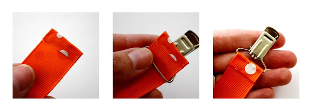 Step Four: On the other end of the ribbon, place hot glue along the edge and fold over 1/4 inch, just as you did the first side. Feed the ribbon up through the back side of the mitten clip. Place hot glue along the edge, fold over, and press firmly to secure the mitten clip to the ribbon.
