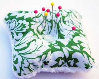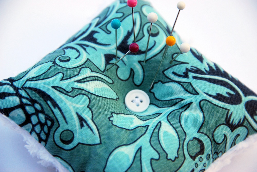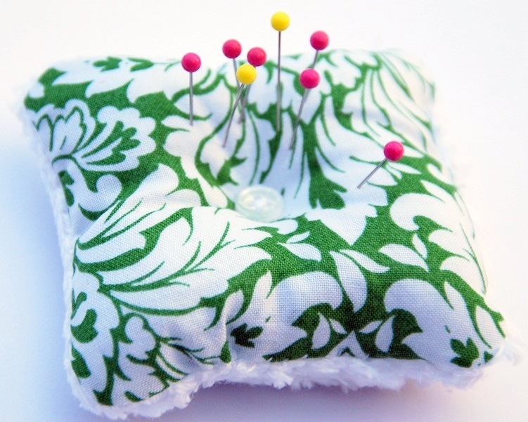 Petite pincushions measure 3 inches square. They may be be small, but the designer fabric used packs a big punch! The other side of the pincusion is white chenille. Use either side–they’re reversible! A perfect gift for the sewing fanatic in your life…or for you, because you need a little cuteness while you create!
